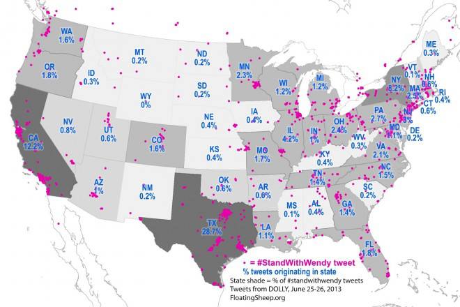 The map above, created by the academic research group Floating Sheep, shows that while the volume of Twitter activity for #StandWithWendy was—naturally—greatest in Texas itself (nearly 29 percent of all tweets), there was also quite a bit of chatter coming out of places like New York state (8 percent), California (12 percent) and even places like Illinois (4 percent).That should tell you everything you need to know about the 'emerging groundswell in Texas' narrative.